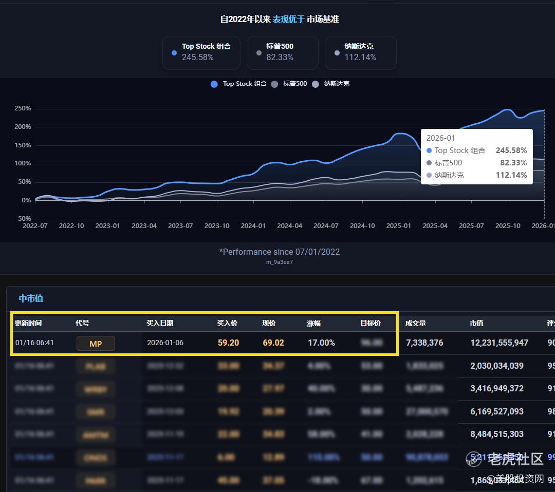 而在科技博弈层面,格陵兰南部的Tanbreez矿产拥有世界顶级的重稀土储备,其重稀土占比高达27%。在2025年中.国实施重稀土出口管制后,这成了纳指科技巨头、导弹制导系统和特斯拉电机的唯一生命线。相关 美股代号 MP ,我们美股投资网的强势上涨股 Top Stock服务早在年初59美元入场,目前浮盈 17% ! $MP Materials Corp.(MP)$
