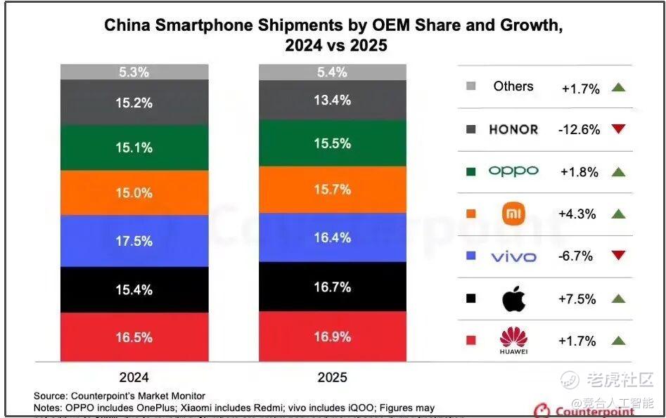 当Counterpoint 2025年最新中国手机市场份额报告出炉时,荣耀以-12.6%的同比增速跌幅成为榜单中最刺眼的存在。从2024年的15.2%到2025年的13.4%,这场两位数的市场份额跳水,不仅让荣耀跌出了头部阵营的舒适区,更折射出中国智能手机市场存量竞争下的残酷真相。