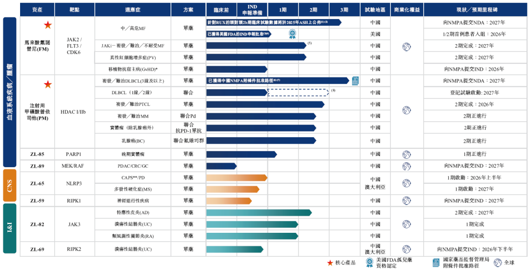 马来酸氟诺替尼(FM),目前正在推进3期注册阶段,是一款Janus激酶2 (JAK2)、FMS样酪氨酸激酶3 (FLT3)及细胞周期蛋白依赖性激酶6 (CDK6)的新型三靶点抑制剂,主要用于治疗骨髓增生性肿瘤(MPN),包括骨髓纤维化及真性红细胞增多症(PV)。除骨髓纤维化外,公司于2025年11月在中国启动了一项FM针对PV的2期临床试验,目标是扩大FM在MPN领域的临床及商业潜力。此外,公司计划于2026年向NMPA提交FM治疗移植物抗宿主病(GvHD)的IND申请。