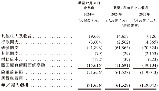 招股书显示,在过去的2024年和2025年前九个月,赜灵生物未有营业收入,相应的净亏损分别为人民币0.92亿、1.19亿元。