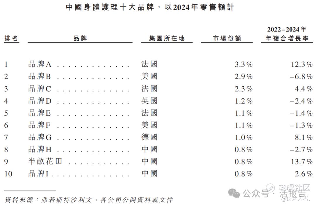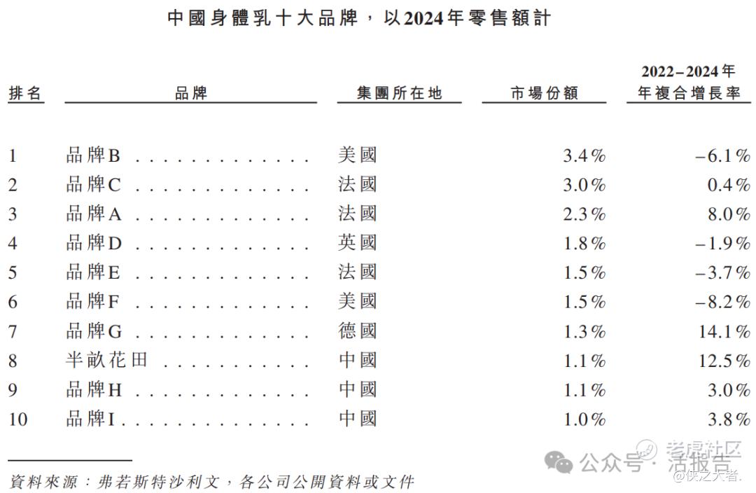 公司的身体乳产品线于2012年上市,截至2025年9月30日,该产品线累计销售约56.9百万瓶。根据弗若斯特沙利文的资料,以2024年零售额计,公司是中国身体乳市场(包括所有国际与国货品牌)第八大品牌,也是该品类国货第一品牌。