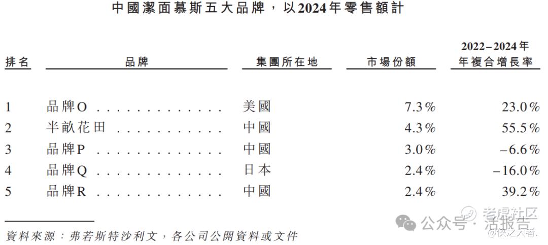 根据弗若斯特沙利文的资料,以2024年零售额计,半亩花田是身体乳、身体磨砂膏、洁面慕斯的国货第一品牌。