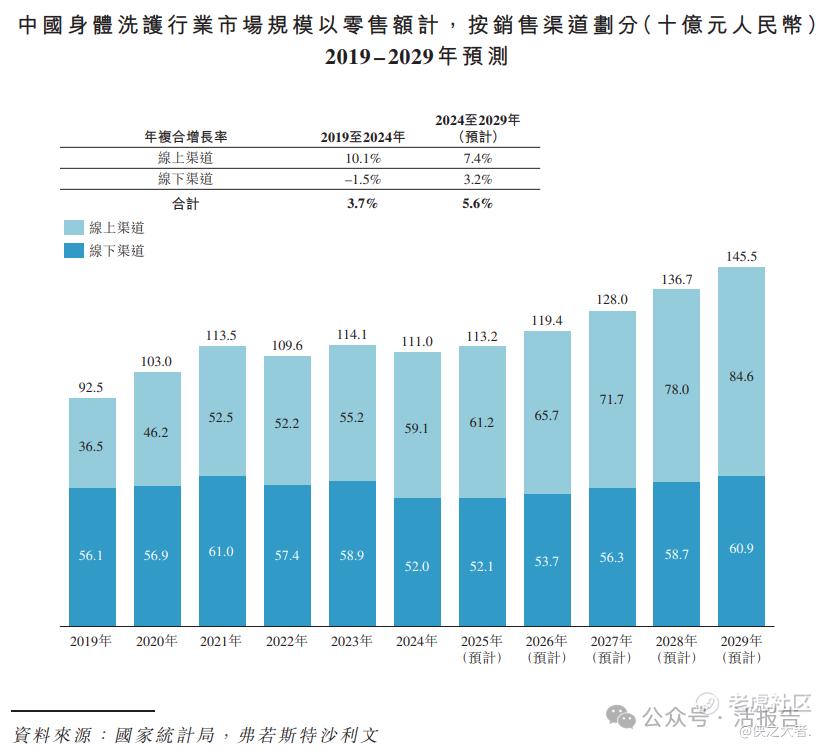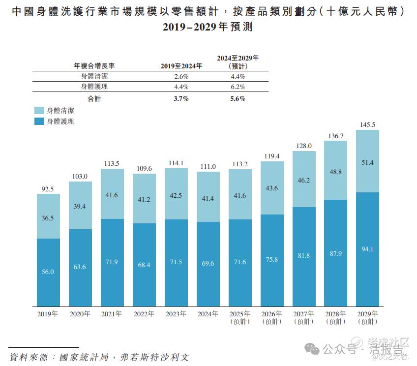 根据弗若斯特沙利文(Frost & Sullivan)的报告,以零售额计,中国身体洗护行业市场规模由2019年的人民币925亿元增长至2024年的人民币1110亿元,复合年增长率为3.7%。该市场规模预期到2029年将以5.6%的年复合增长率增长至人民币1455亿元。