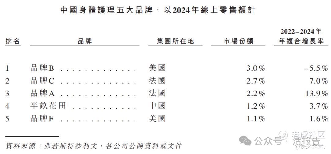 以2024年零售统计,半亩花田是中国第九大身体护理品牌,市场份额为0.8%。以2024年线上渠道零售额计,半亩花田是中国第四大身体护理品牌,是前五大品牌中唯一的国货品牌,市场份额为1.2%。