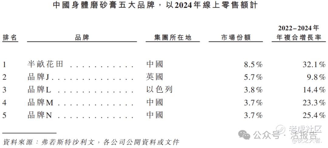 公司的身体磨砂膏产品线于2015年推出,截至2025年9月30日,累计销售约37.7百万瓶,使公司成为中国身体磨砂膏市场(包括所有国际与国货品牌)第二大品牌。以2024年零售额计,公司也是该品类国货第一品牌。