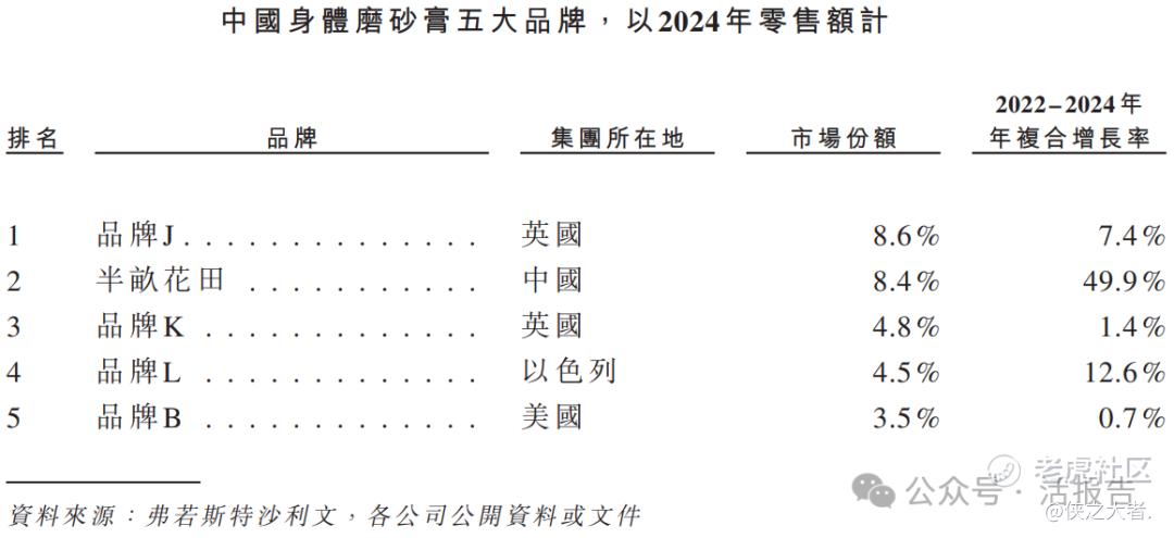 以2024年零售统计,半亩花田是中国所有国际及本土品牌之中第二大身体磨砂膏品牌,亦是中国最大国货身体磨砂膏品牌。以2024年线上渠道零售额计,半亩花田是中国第一大身体磨砂膏品牌,市场份额为8.5%。