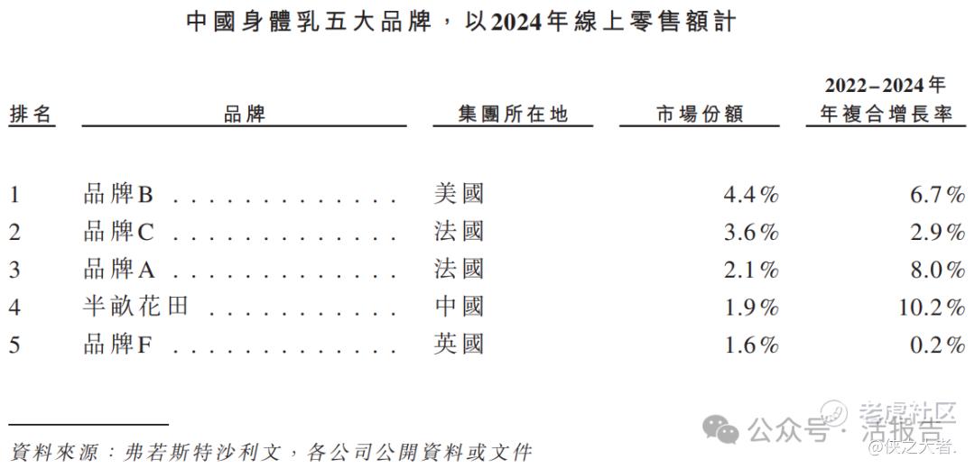 以2024年零售统计,半亩花田是中国第八大身体乳品牌,亦是最大国货身体乳品牌。以2024年线上零售统计,半亩花田是中国第四大身体乳品牌,亦是前五大品牌中唯一的国货品牌,市场份额为1.9%。