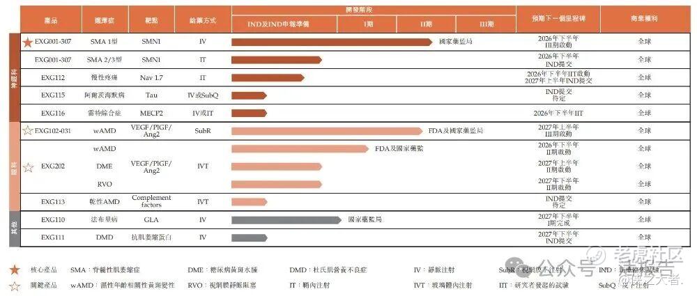 (ii)两款关键候选产品,即EXG102-031(一种用于治疗湿性年龄相关性黄斑变性(wAMD)的基于AAV的基因疗法)和EXG202(一种用于治疗眼底新生血管疾病(包括wAMD、糖尿病黄斑水肿(DME)及视网膜静脉阻塞(RVO))的基于AAV的基因疗法)。