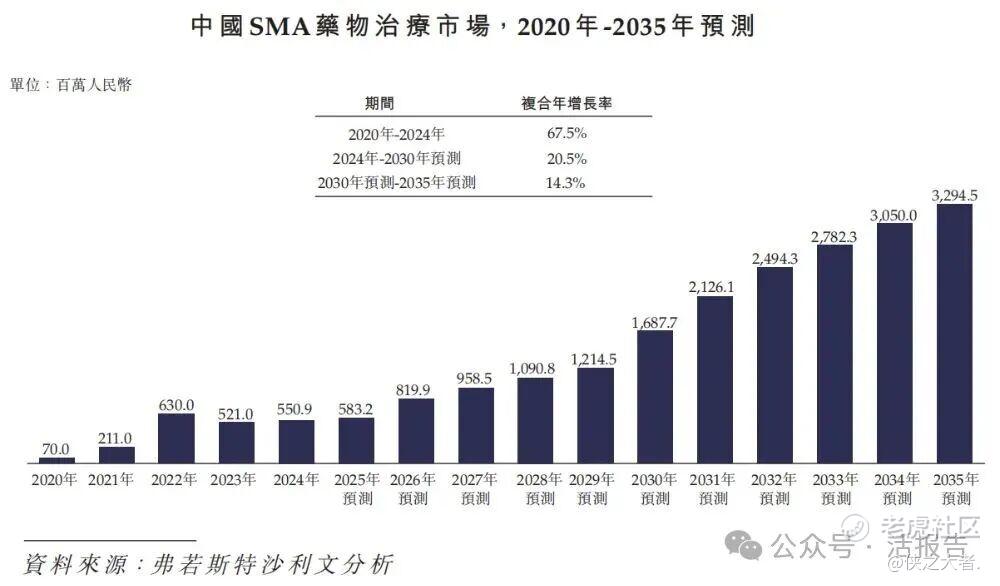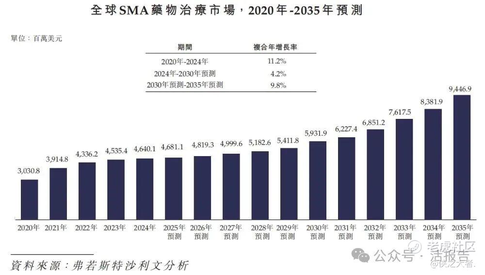 根据弗若斯特沙利文(Frost & Sullivan)的报告,全球SMA药物市场由2020年的30.308亿美元增长至2024年的46.401亿美元,复合年增长率为11.2%,预计将于2030年进一步增长至59.319亿美元,2024年至2030年的复合年增长率为4.2%,并于2035年增长至94.469亿美元,2030年至2035年的复合年增长率为9.8%。