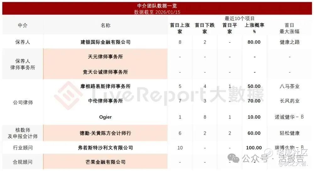 据**大数据统计,Exegenesis中介团队共计9家,其中保荐人1家,近10家保荐项目数据表现良好;公司律师共计3家,综合项目数据表现差强人意。整体而言中介团队历史数据表现普通。