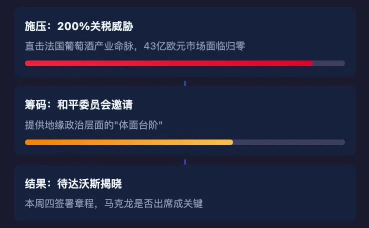 与此同时,此前明确拒绝"和平委员会"的马克龙,据称态度出现松动。美国是香槟最大出口市场,年销2690万瓶、价值8.1亿欧元——这场贸易战的stakes,远比表面看起来更大。