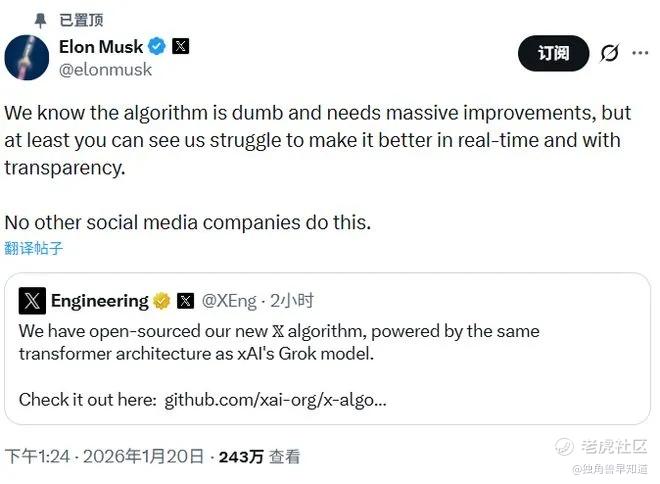 马斯克麾下的社交媒体平台X正式将平台算法开源,现已能在Github上访问。平台强调,已经彻底移除了系统中所有人工设计的特征,以及绝大多数人为设定的规则。整个系统几乎完全依赖基于Grok模型来承担核心工作。推荐系统会把用户关注对象以及“没有关注、但系统觉得用户可能会感兴趣”的内容拉进同一个池子里,然后通过AI模型筛选、打分并排序。(财联社)