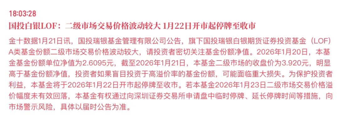 1月21日晚间,国投瑞银基金发布紧急公告:旗下国投白银LOF(161226)A类份额因二级市场价格波动过大,将于1月22日全天停牌。