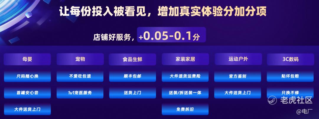 具体而言,围绕商品质量、物流速度、服务保障三个方面,淘宝天猫将推出多个细分小项,分别可加分0.05-0.1分不等。例如,母婴行业的加分项为尺码随心换、首罐安心尝等;运动户外行业的加分项为官方鉴别、大件送货上门等。超过4.8分并提供优质特色服务的高分店铺将有望获得“好服务”榜单透标,进一步获得平台高标准曝光。为此,淘宝天猫首批邀请超过1000家店铺参与内测,母婴及宠物行业首批20家品牌将于1月底上线。