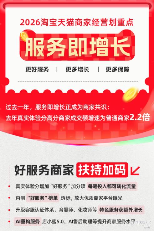 淘宝率先迈出了一步。1月20日,淘宝天猫在商家服务大会上宣布,平台将在2026年推出四大举措,通过升级真实体验分加分体系、内测“好服务”榜单、引入专业客服认证、加大AI投入等具体动作,帮助数百万优质商家做好服务,为其收获增长保驾护航。