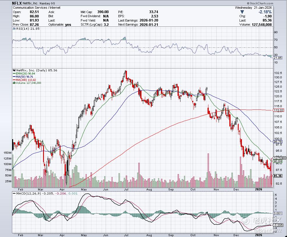 周三, $奈飞(NFLX)$ 再次上演了"梅开二度"的戏码——继2025年10月第三季度财报后第二次出现业绩后跳空下跌。尽管公司基本面看似稳健,甚至交出了史上首个营收破120亿美元的季度答卷,但股价却遭遇下挫。目前,股价较去年高点已回撤36.35%,并创下52周新低。
