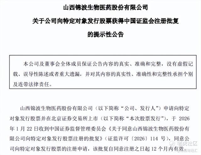 1月22日,山西医美上市公司锦波生物(920982.BJ)发布公告,公司收到中国证监会批复,同意公司向特定对象发行股票的注册申请,该批复自同意注册之日起12个月内有效。