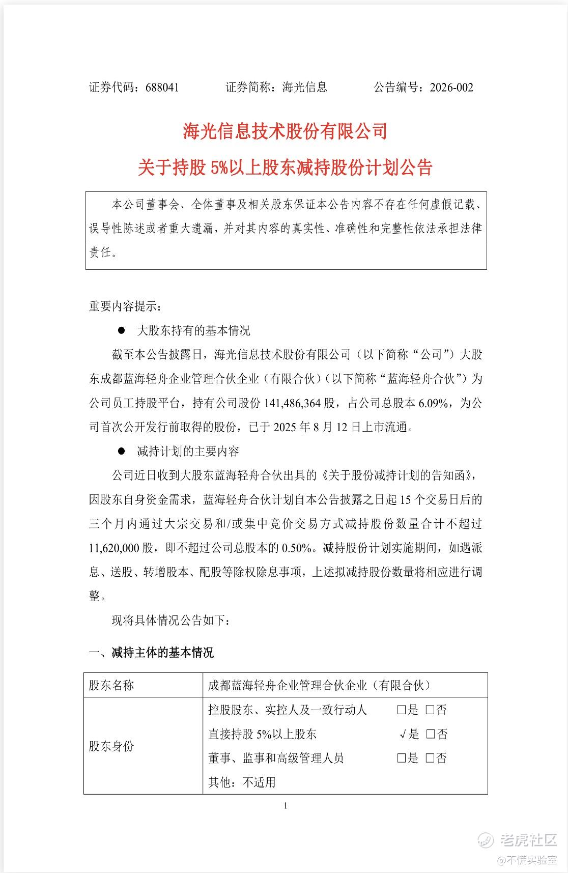 2026年1月22日,海光信息发布减持公告,持股6.09%的第四大股东蓝海轻舟因自身资金需求,计划减持不超过公司总股本0.50%的股份,减持股份均为首次公开发行前取得。