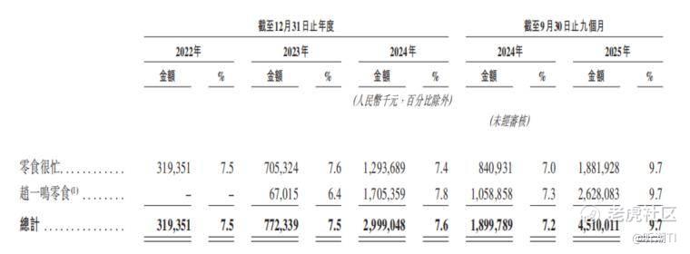 招股书数据显示,截至2022年底,“零食很忙”门店为1902家;通过收购赵一鸣后,“零食很忙+赵一鸣”合计门店数在2023年底达到6585家;到2024年底,这一数字进一步扩张到1.4万家;截至2025年9月30日,两大品牌合计门店达到1.9万家,其中零食很忙8419家,赵一鸣1.1万家。