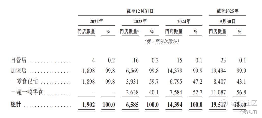 核心是加盟,而不是直营。鸣鸣很忙在招股书中反复强调,业务发展“依赖于与认同我们价值、共同发展品牌及门店网络的加盟商合作”。在往绩记录期间,门店网络几乎完全由加盟店构成,公司自营店仅为战略性用途,不承担主要规模。