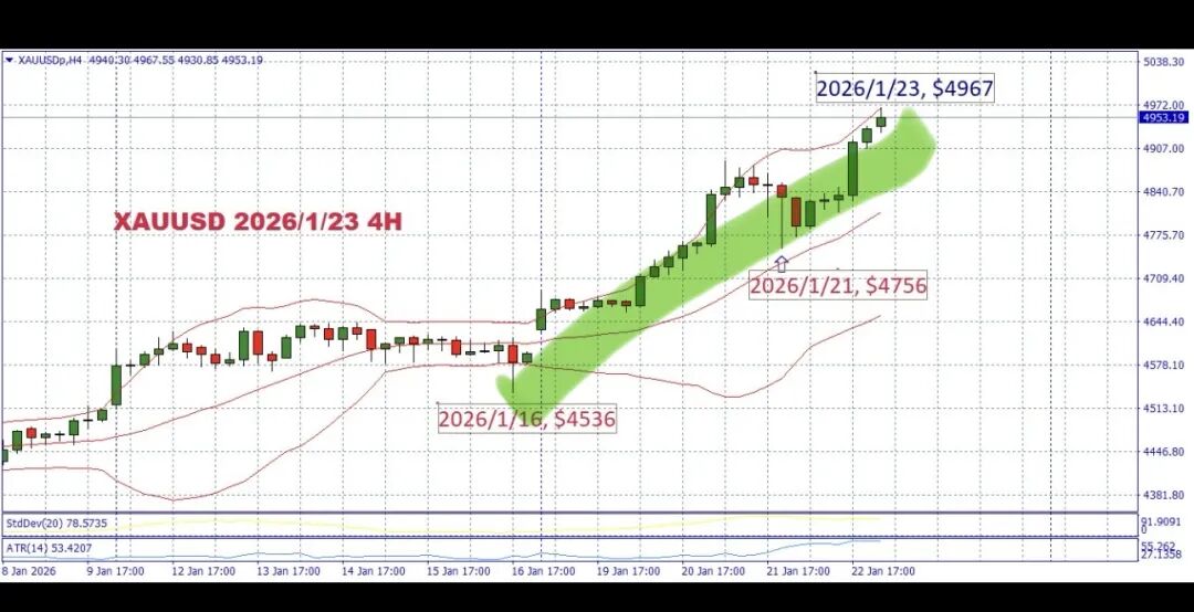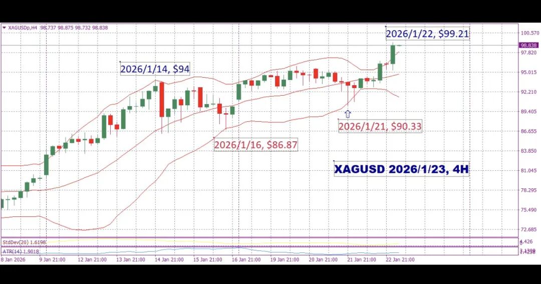 白银昨夜突破$96阻力位,收盘$96.15。今天延续升势,最高冲至$99.21,离$100心理大关只有一步之遥了。黄金今天最高达$4967,似乎也要冲刺$5000大关了。