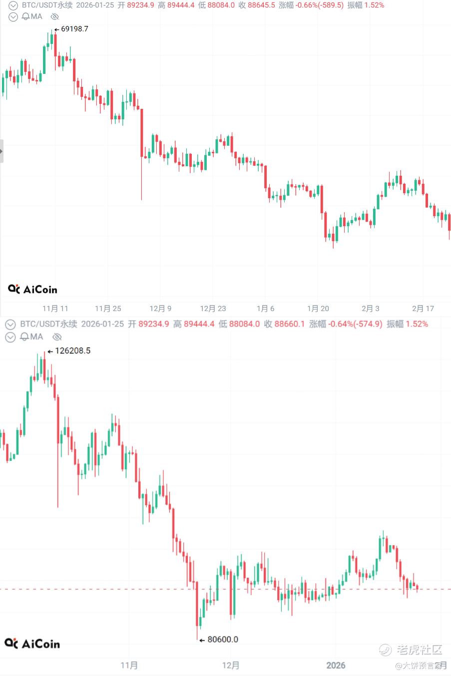 那么2026年的熊市,大饼目前从12.6万跌到最低8万,跌幅36%。如果这个跌幅,同样只是熊市全部跌幅的一半的话,就意味着要跌2个36%,也就是一共59%的跌幅。