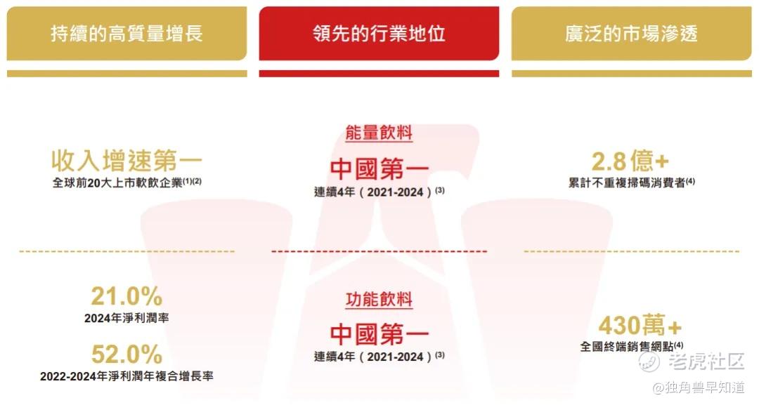 据招股书,东鹏饮料是中国第一的功能饮料企业,收入增速在全球前20大上市软饮企业中位列第一。根据弗若斯特沙利文报告,按销量计,公司在中国功能饮料市场自2021年起连续4年排名第一,市场份额从2021年的15.0%增长到2024年的26.3%。按零售额计,公司是2024年第二大功能饮料公司,市场份额为23.0%,领先地位持续夯实。
