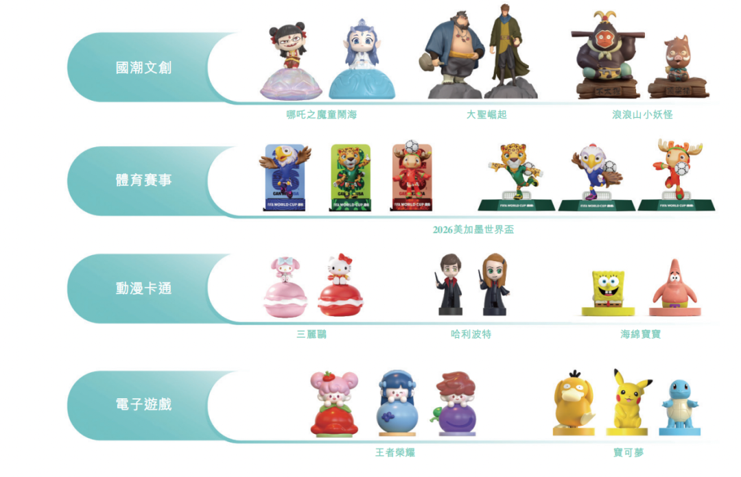 桑尼森迪的策略是,与知名IP合作。截至2025年9月30日,桑尼森迪与超过20个IP达成授权合作,共交付217个IP玩具产品SKU。包括国潮文创、体育赛事、动漫、电子游戏等IP类别。