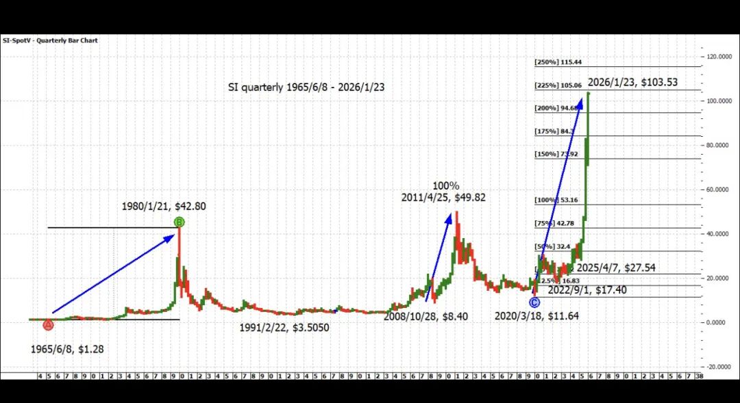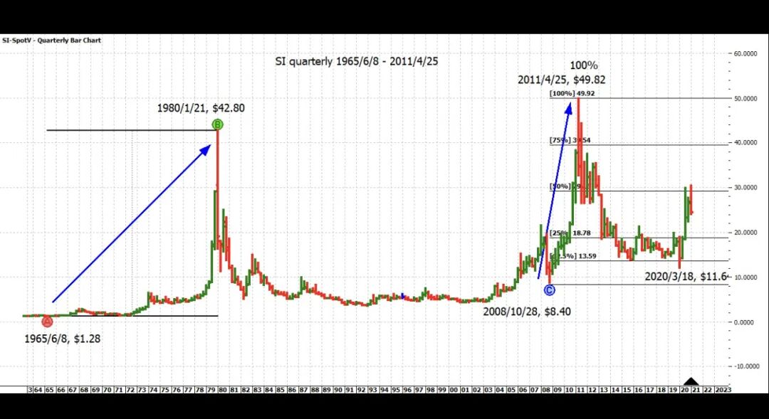 1.白银季线图的三浪上升。