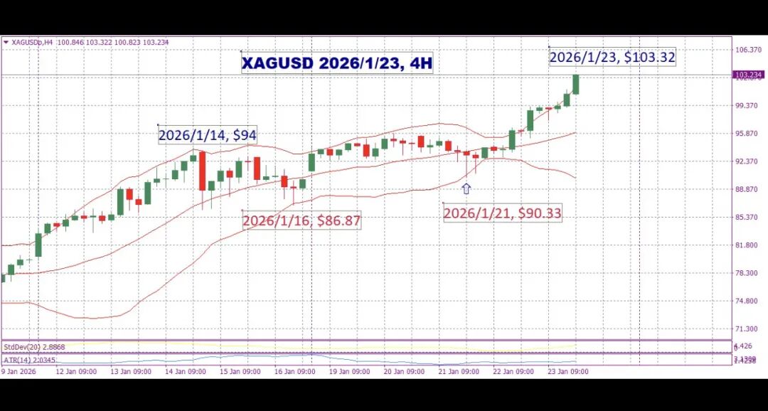 周五1月23日夜盘,白银轻松突破了$100整数关口,此后升至$103.33,收盘$103.23。