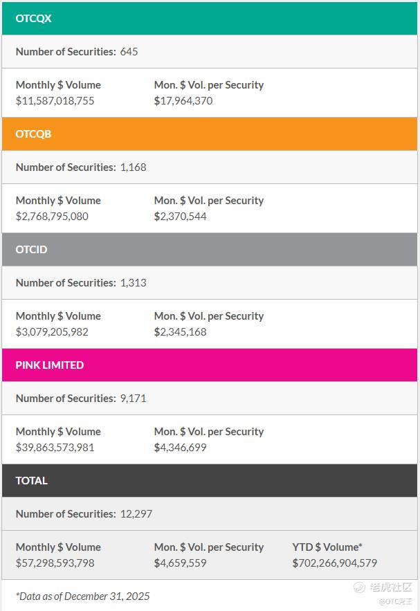 据美国OTC市场最新数据显示,整个12月市场有12297家企业挂牌交易,累计交易额达572亿美元,日均交易额465万美元。截至12月30日成交量达到7022亿美元。