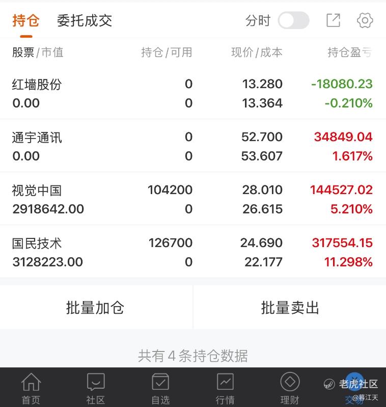 今天又是震荡剧烈的一天,早盘个股一度接近五千只下跌,然后逐步反弹,反弹到情绪明显回暖,指数这边又向下压盘,市场这一阶段的难度,主要是走势不跟随底层规律,该涨时会硬压、该调整时又会强托,而题材的持续性偏一日甚至半日游,因此这里不妨多份耐心,静待更新的题材或更低的机$红墙股份(002809)$ $通宇通讯(002792)$ $盈方微(000670)$ $国民技术(300077)$ $视觉中国(000681)$