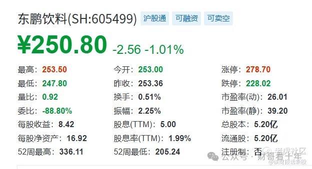 截止写文,A股东鹏今天下跌了1个点,收在250.8元,则目前东鹏饮料H股的折价率为11.6%