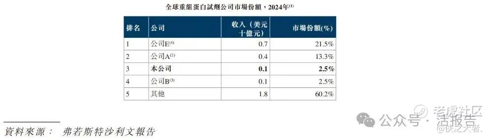 根据弗若斯特沙利文的资料,在全球重组蛋白市场中,按2024年收入计,公司在所有中国本土供应商中排名第一,在全球所有供应商中排名第三。同年,公司在中国生物试剂行业的所有供应商中排名第四。
