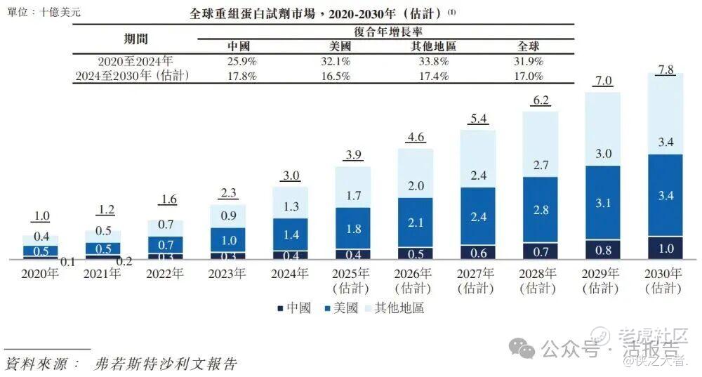 根据弗若斯特沙利文(Frost & Sullivan)的报告,2020年,全球及中国重组蛋白市场分别达10亿美元及1亿美元,分别以复合年增长率31.9%及25.9%达到2024年的30亿美元及4亿美元。预测该等市场将进一步扩张至2030年的78亿美元及10亿美元,2024年至2030年的复合年增长率分别为17.0%及17.8%。
