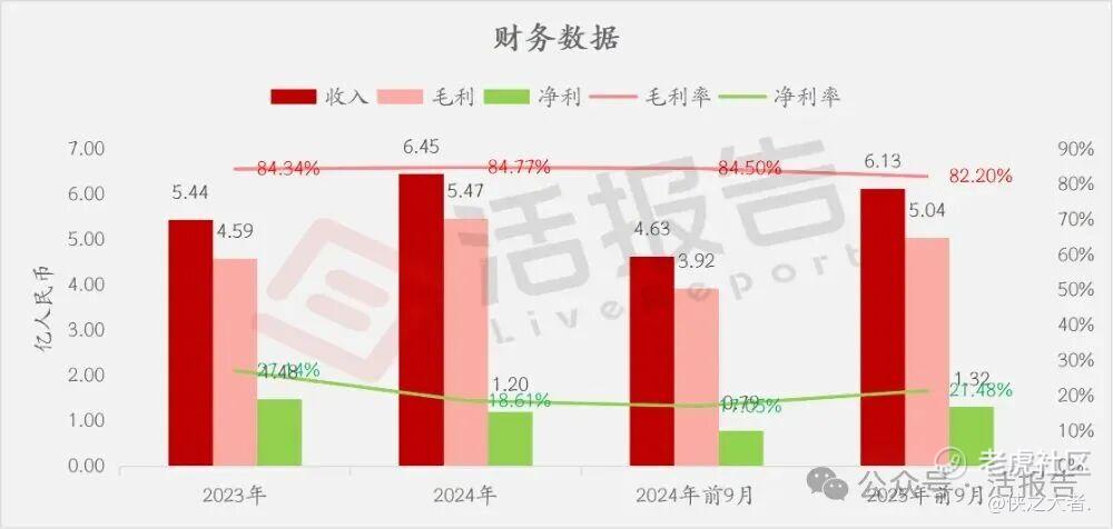 收入分别约为人民币5.44亿、6.45亿、4.63亿、6.13亿,2025年前9月同比+32.26%;