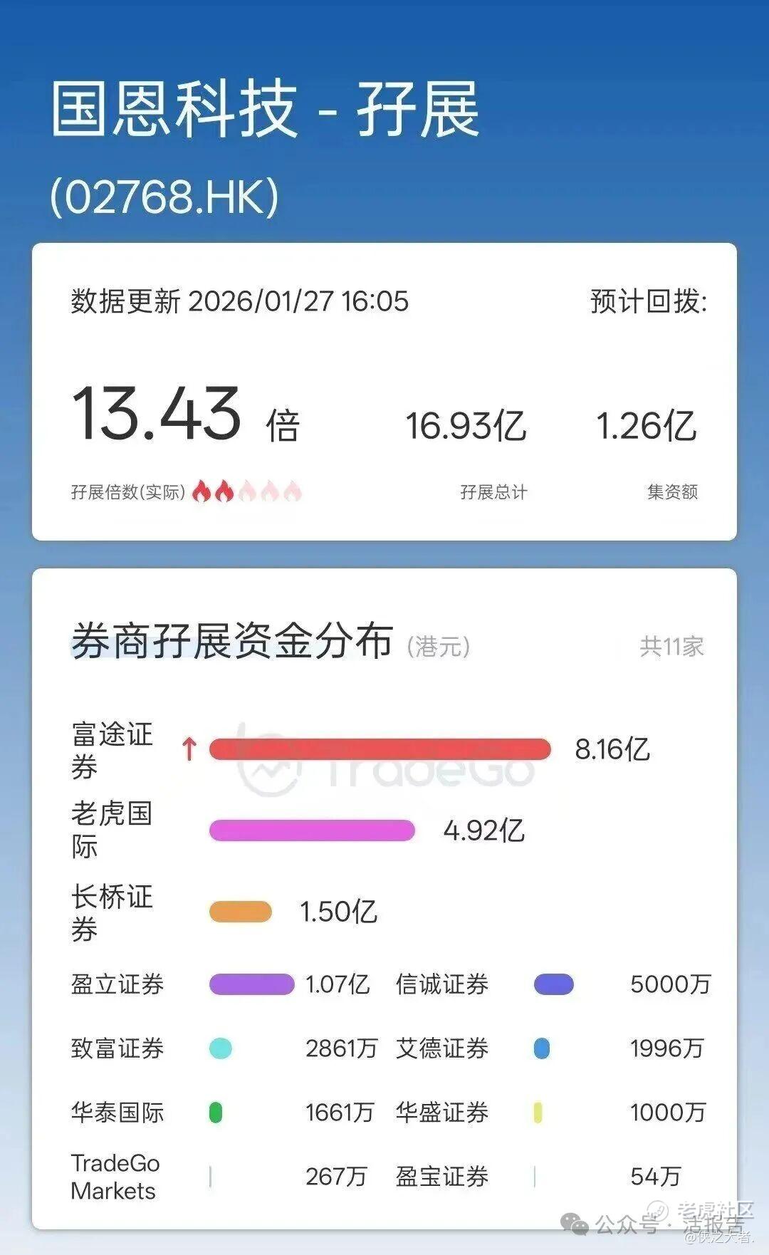 据TradeGo新股孖展数据,截至1月27日16时,国恩科技的孖展认购总额已达16.93亿港元,孖展认购倍数约13.43倍。其中,富途证券、老虎国际、**证券分别放出8.16亿、4.92亿、1.50亿港元的孖展。