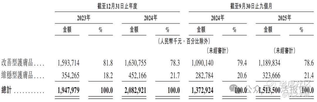 公司收入主要来自护肤品销售,重大部分来自改善型护肤品,2024年占总营收的78.3%,核心包括A醇成分护肤品、α-熊果苷焕颜精萃水等明星产品;维稳型护肤品占比21.7%,为重要补充。