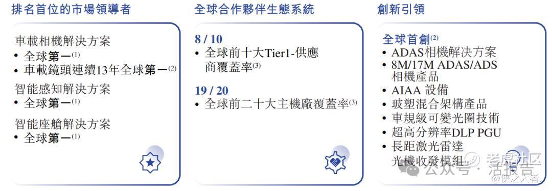 2024年车载相机解决方案出货量全球第一,智能感知和智能座舱解决方案出货量均为全球第一,车载镜头连续13年全球市占率第一。