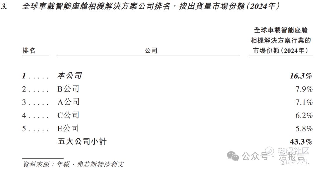 以2024年出货量市场份额计,公司在全球车载智能座舱相机解决方案公司中排名第一。