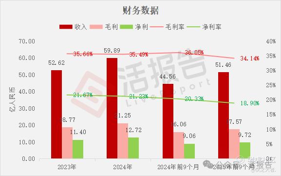 收入分别约为人民币52.62亿、59.89亿、44.56亿、51.46亿,2025年前9个月同比+15.48%;