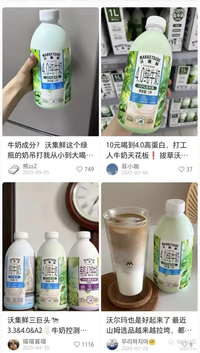 意识到小红书作为品牌阵地的意义后,它从2024年12月就开始,在小红书大力推广一款牛奶。这是沃集鲜最成功的产品之一,9.99元的1L装,在沃尔玛小程序热卖榜排名第一,销量超187.3万份——作为对比,山姆MM系列的一款饼干,周销超过20万件。显然,沃集鲜的进步空间还很大。