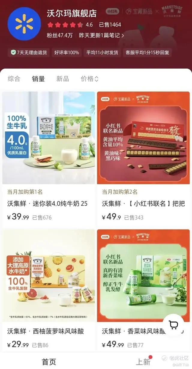目前来看,沃尔玛的小红书店铺里,销量最好的商品是售价39.99元的迷你装纯牛奶,但总销量也只有678件(截至1月28日)。考虑到这场合作的声量和双方的体量,这个成绩算不上优异。