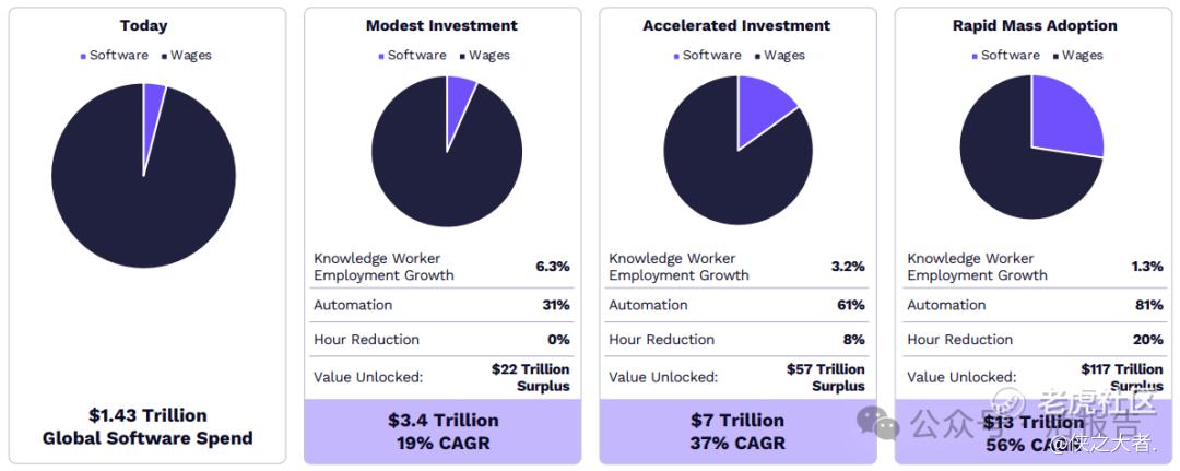 随着企业越来越多地使用AI来增强知识工作者,全球软件支出的增长率可能会从过去十年的14%加速到未来五年的19%~56%,快速大规模采用的情况下,有望实现高达13万亿美元规模。