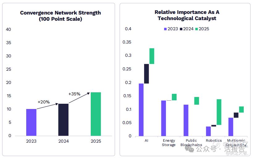 颠覆性技术正相互交织,网络融合强度(Convergence Network Strength,衡量颠覆性技术相互促进和催化程度的指标)同比提升了35%。
