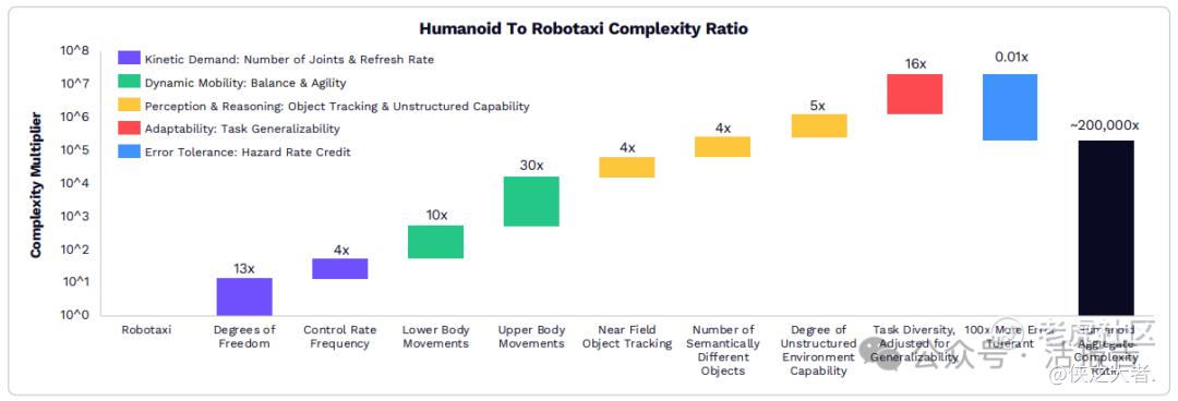 人形机器人的操作复杂度(复杂度比率定义了实现完全自主所需的理论能力)可能比无人出租车高出指数级。这两个平台在动力需求、移动性、感知能力、适应性和容错能力方面都存在显著差异。