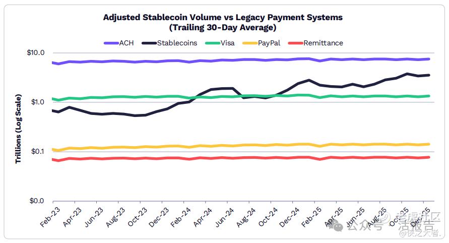 截至2025年12月,经调整的稳定币交易量过去30天的平均值为3.5万亿美元,是Visa、PayPal和汇款总价值的2.3倍。Circle的USDC占主导地位,市场份额约60%,Tether的USDT约占35%。