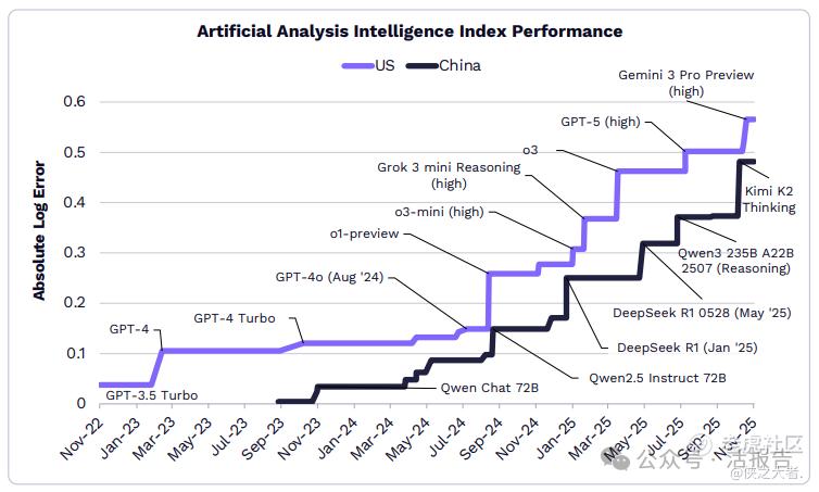 美国与中国在激烈的模型全球竞争中处于领先地位。中国模型的性能目前仅落后美国约六个月,尽管在前沿模型稍有落后,但在开源模型上占据主导地位。市场上表现最佳的十款开源模型中有八款都出自中国,且全部超越曾经的开源领导者Meta。
