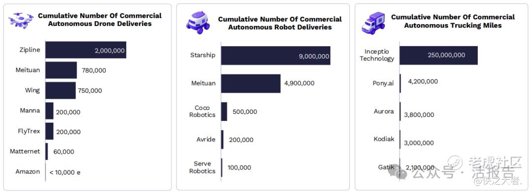 另外,自动驾驶物流同样前景广阔。全自动化配送时代已经到来,全球无人机和移动机器人实现的完全自主“最后一公里”配送量已超过每年400万次。与此同时,无人驾驶长途卡车运输已在美国启动,运营商正计划快速扩展路线。