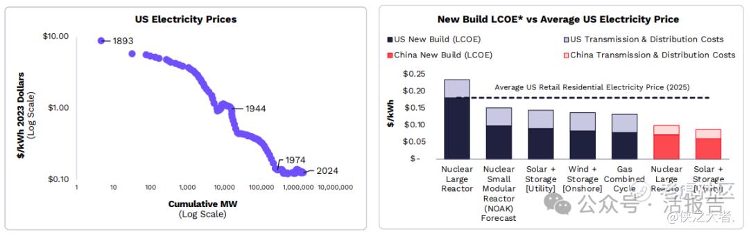 电力供应的增加会降低电价。ARK研究显示,根据莱特定律,除二战期间外,美国电价从19世纪末到1974年稳步下降,之后因监管加强导致核能建设成本上升而中断。如果监管没有加强,今天的电价可能会比实际水平低约40%。随着低成本发电规模扩大并满足耗电量巨大的AI数据中心需求,零售电价在停滞50年后应该会重新开始下降。